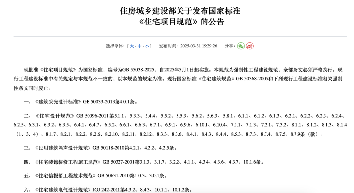 今年3月31日,住建部发布国家标准《住宅项目规范》(以下简称住宅新国标),将于5月1日起正式施行。